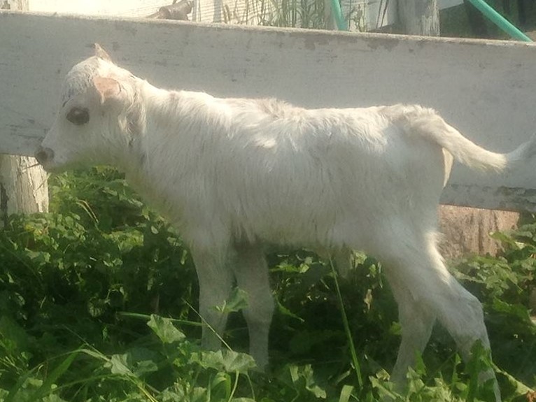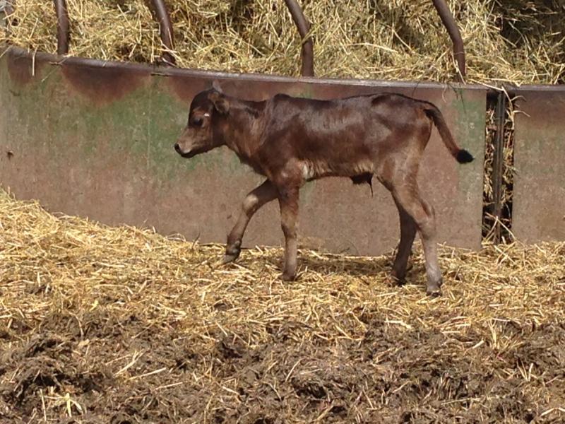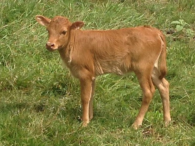 OG Monica a heifer out of Bottoms Up by Ted. April 25th, 18.5 inches/19 lbs. She is a little sweetie. She has great color. A unique buckskin color. She is going to be a very pretty cow. She is a great-granddaughter to our cow Sugar Plum. She is a keeper