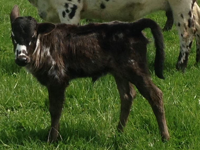 Vannillie Bull. He was born April 14. He was 22 inches and 28 lbs by Tyson. He has a great color mix and could end up brindle. If so, it happens about 3-4 months old. His mother has brindle but it is hard to know for sure if it will pass through. Vanillie had 5 heifers in a row and now this is the second bull in a row. We need to get back to heifers. SOLD TO CALIFORNIA
