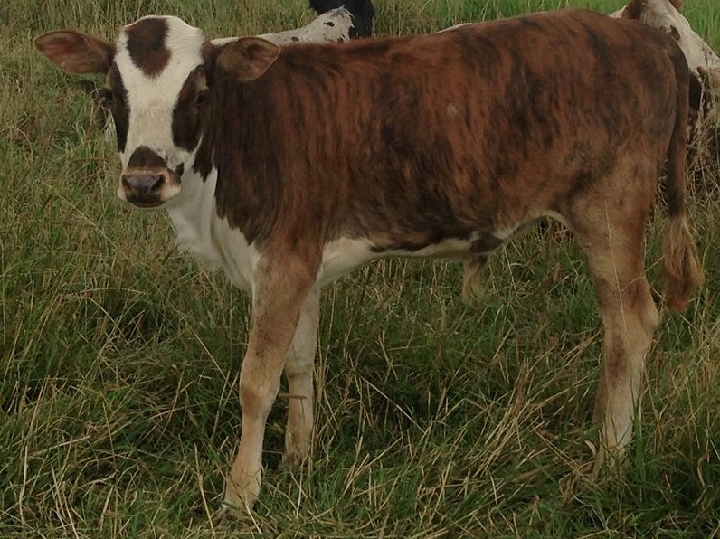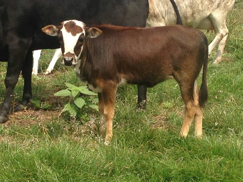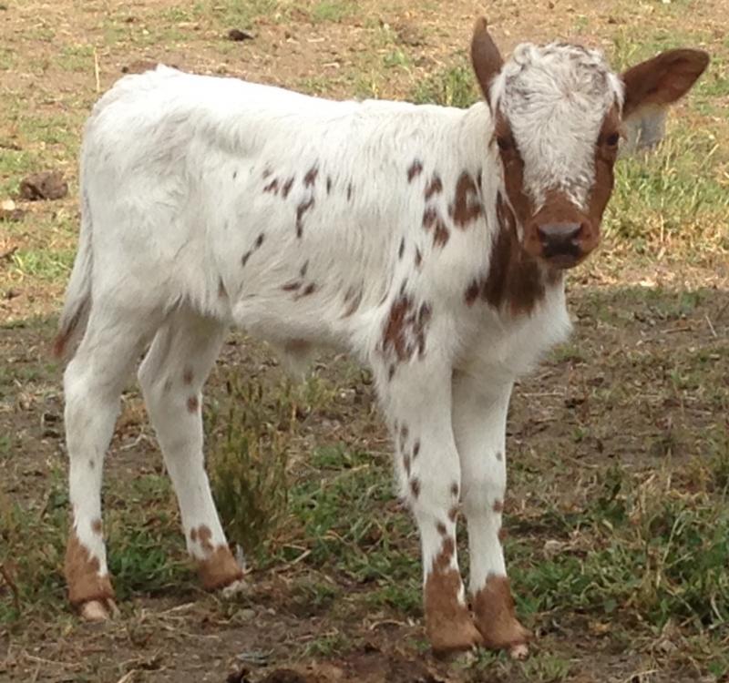 Bull out of KC by Tyson. A chocolate white park. He is full of it. He can hardly sit still. He was 21 inches and 25lbs at birth. Born July 26. Steer $800 Bull $1500