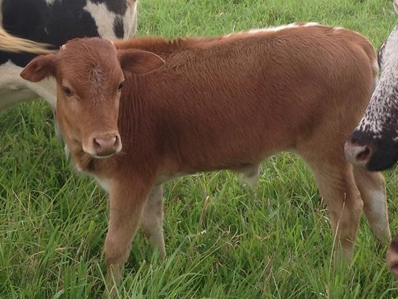 Ruby is a heifer out of Showgirl by Ted. Born July 15, 18 inches/ 22lbs. A little suprised by the color but a great little calf. She is starting to get black stripes across her red. SOLD TO CALIFORNIA