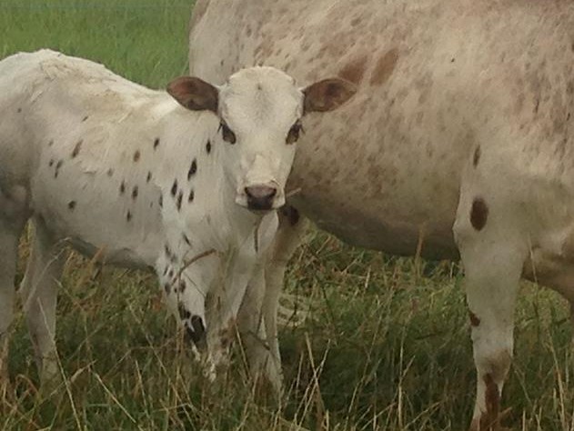 Heifer out of Tiger Lady. A beautiful freckle faced heifer. She is out of a colorful brindle cow and Ted, our speckled bull. This girl has alot of potential. He color may change. Born June 19, she was 23 inches and 35 lbs. SOLD TO CALIFORNIA