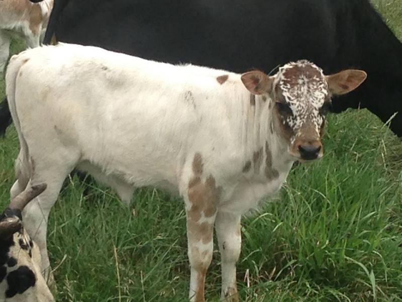 Bull out of Snookie by Tyson. April 25th, 21 inches/24lbs. This would be out of the same cow as Ted. He is a red white park with a few extra spots. He is a nice little bull. If you like color, this guy has it. FOR SALE $800 steer or $1500 bull.