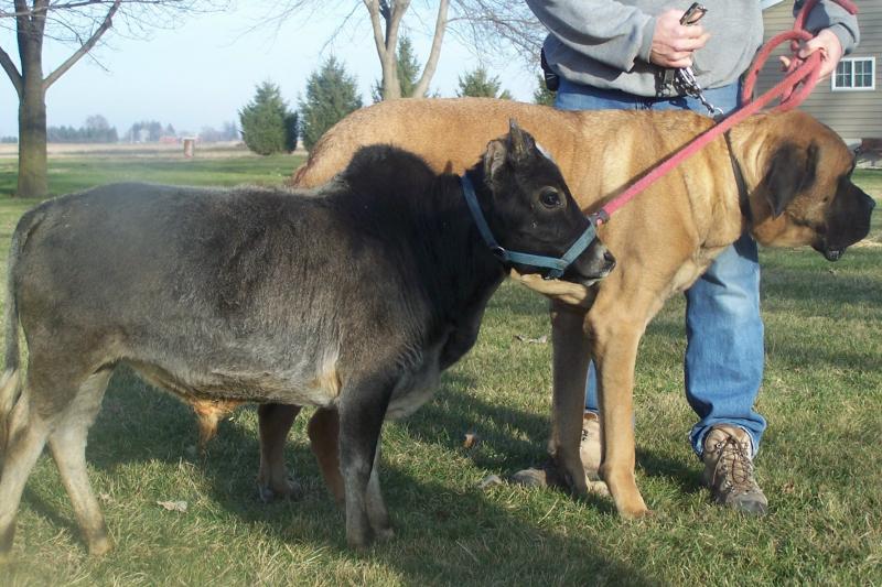 We have young bulls available that we think would make good breeders. Other bulls we keep back that we think will improve our herd. Like this 18 month old bull, 26.5 inches tall next to a friend's English Mastiff.