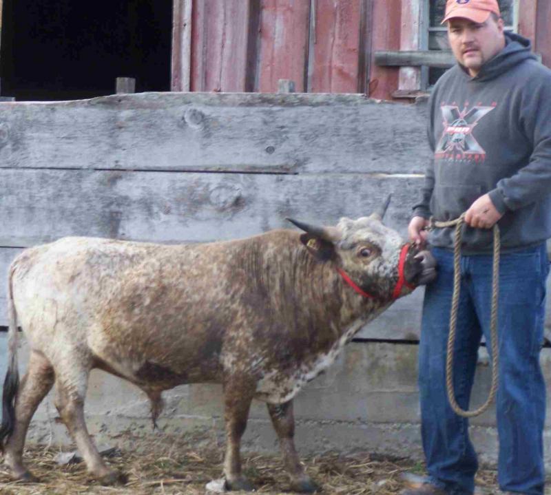 Hurricane was a super nice bull. A tri-colored brindle out of a super cow Katrina. His son above Red-Handed added to our herd too. This bull was bred and born here like most of the ones on this list. His grandbabies have taken over. This guy moved on to Indiana and had some good ones there tolbso. 35 inches and 380lbs.